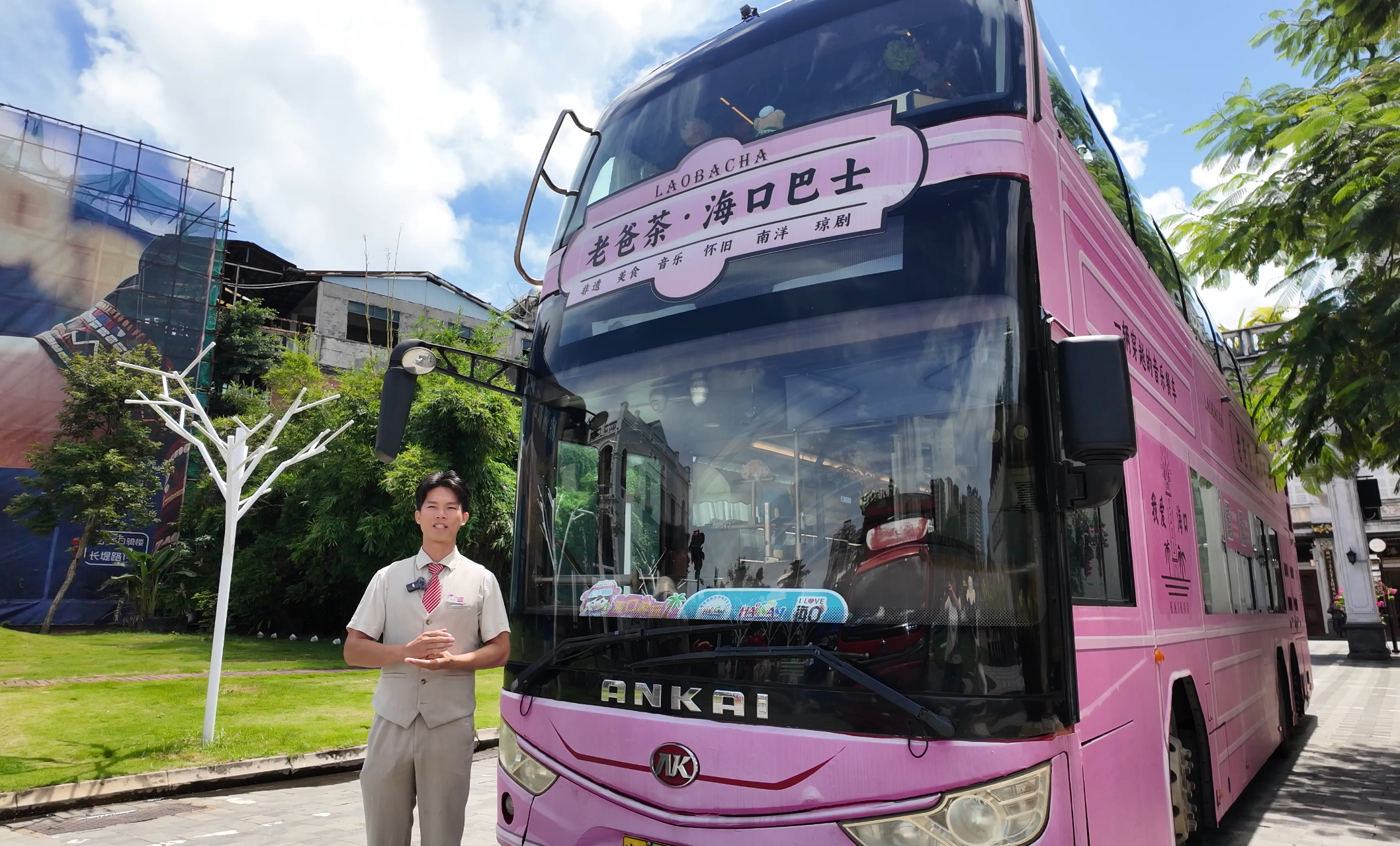 “为什么要把老爸茶和双层巴士结合?”面对这个问题,“老爸茶”海口巴士乘务长李献戟的回答满是对本土文化的热爱:“老爸茶是海南人刻在骨子里的生活方式,而观光巴士是游览城市风景的最佳载体。我们想做的,就是把本地人的日常,搬到车上——让游客一边看风景,一边喝茶,沉浸式感受海口的烟火气。”